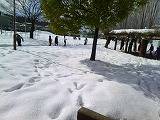 校庭には60センチほどの雪があります。三つ子山では楽しく滑り降りたりの雪遊びはしていますが、運動場へは雪が深くて遊びにでれないようです