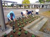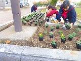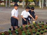朝始業前、すっかり色づいた木々の玄関前花壇では、プロジェクトのメンバーが集まり花壇の手入れをしていました。夏の間にさいていたひまわりやコスモスのかわりにパンジーを植えました。これから寒い朝を迎える日が多くなりますが、色とりどりの花で心が温かくなりそうです。