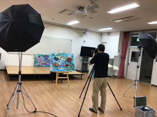 生徒たちが創意工夫を凝らして描いた原画3枚は、プロのカメラマンの手によって一枚一枚丁寧に撮影されました。原画の魅力が最大限に引き立つよう、左右からスポットライトを当て、光の具合を細かく調整しながらシャッターを切る姿がとても印象的でした。