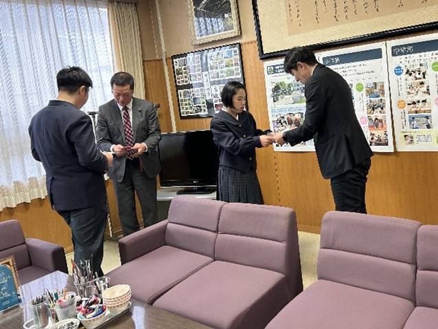 まず,生徒たちは,記者の方と名刺交換を行いました。名刺交換の習慣は,コカ・コーラ環境教育賞で北海道の研修旅行に行った際に参加者から教えていただいたものであり,今回は,早速,自作の名刺を使って北國新聞社の記者の方と名刺交換をしました。自分たちが制作した名刺を照れながら交換した様子はとても初々しく素敵でした。