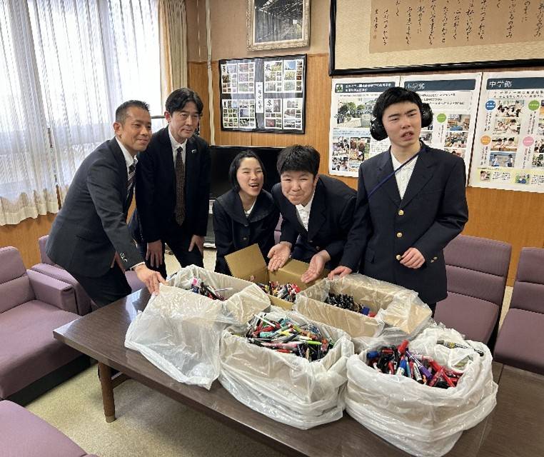 この問いから始まったのが、「不要文具リサイクルプロジェクト」です。今年で2年目を迎えました。本年度も、心強いサポーターとして明治安田生命の皆様にご協力いただき、2月18日(水)には本校中学部生徒代表へ、たくさんの不要文具をご寄贈いただきました。本校では、いただいた文具を一つ一つ手作業で分解し、プラスチック部分とそれ以外の素材に分別しています。さらに色分けを行い、アクセサリー制作に活用するとともに、再生利用を行う企業へ送るなど、資源循環につなげています。この取り組みは、単なるリサイクル活動にとどまらず、身近なものから環境問題を考え、自分たちにできる行動を積み重ねる学びの機会となっています。これからも地域や企業の皆様と連携しながら、プラスチック削減と持続可能な社会の実現に向けて取り組んでまいります。