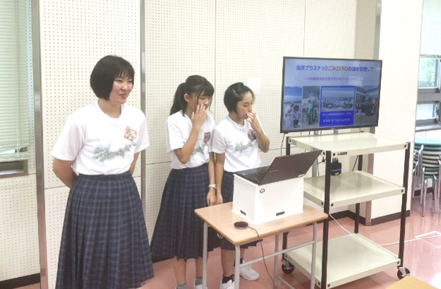 本校からは、中学部がこれまで継続して取り組んできた「海洋プラスチックごみの削減」に関する学習活動を発表しました。代表の3人の生徒は、自分たちが実際に手を動かし、考え、行動してきた活動だからこそ、一言一言に力がこもっていました。その姿からは、環境を守りたいというまっすぐな思いと、自分たちの学びへの誇りが伝わってきました。