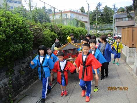 小学部全体で秋祭りが開催されました。児童たちは元気いっぱいに神輿を担ぎ、「わっしょい!」の掛け声とともに近隣の施設まで練り歩きました。今年は屋台も催され「的あて」や「くじ引き」などを楽しみました。屋台の運営は2組が担当し、それぞれが役割を果たしながら、みんなを楽しませることができました。協力して取り組むことで、子どもたちにとって貴重な経験となったようです。