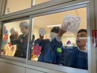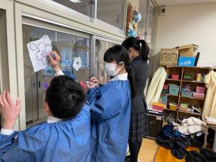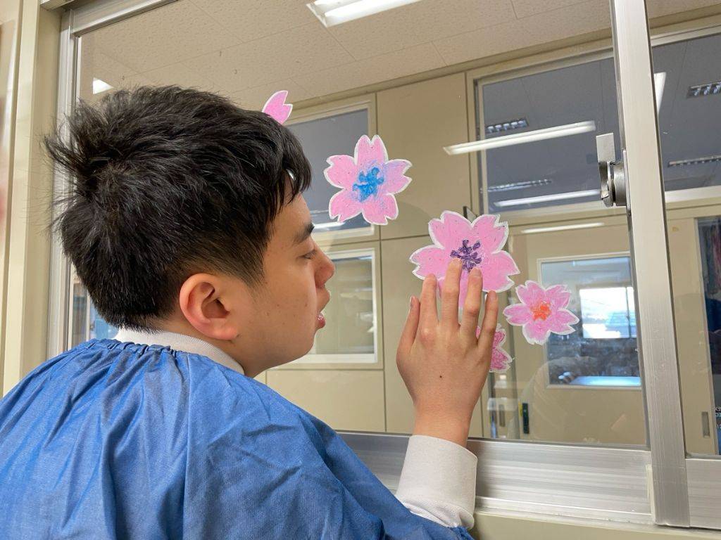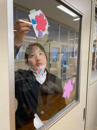 ウィンドウアート制作組は、美術室の窓に桜の花を描きました。新入生に「おめでとう!」を伝えるために「『ここが美術室だよ!』を覚えてもらえるように!」と、新しい仲間との出会いにワクワクしながら制作しました。今年度、キットパスを使って60周年記念の看板やウィンドウアートに挑戦した部員たち、「来年は一人一個、自分のキットパスがあったらいいなぁ!」という言葉が出るくらい、キットパスが大好きになったようです。創作アートクラブでの活動が、いろんな画材や表現に興味をもつきっかけになっていたらと思います。