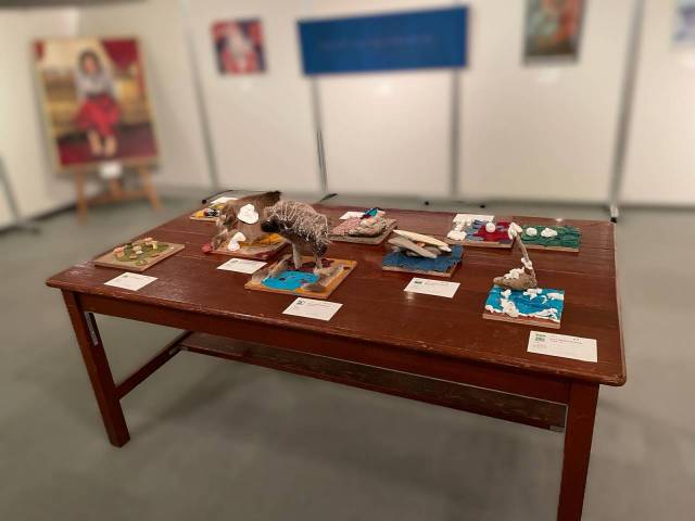 制作テーマは、「自分だけの〇〇な〇〇〇は、どんな世界だろう?」。洪水を耐え抜いた家屋の木材、石、流木、毛皮、革製品の端材、絹糸…など、自然からいただいた素材を用いた立体作品です。