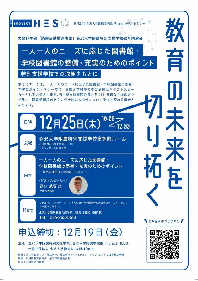 本講演会では、一人一人のニーズに応じた図書館・学校図書館の整備・充実のポイントをテーマに、専修大学教授の野口武悟氏をゲストスピーカーとしてお迎えします。石川県立図書館の協力をうけ、多様な立場の方々が集い、図書館環境のあり方や今後の方向性について学びを深める機会となります。