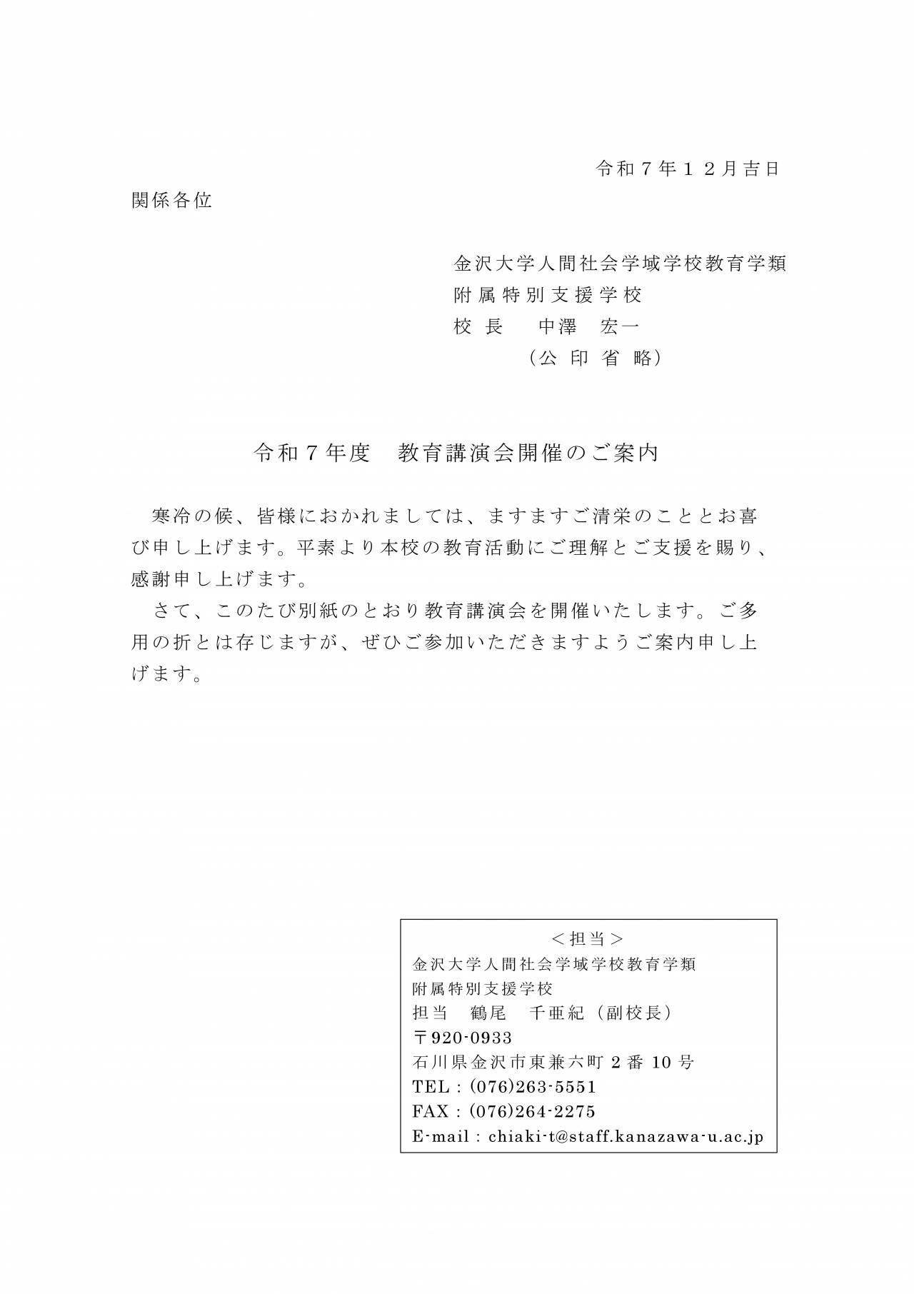 さて、本校の令和7年度冬季教育講演会につきまして別添のとおりご案内をいたします。