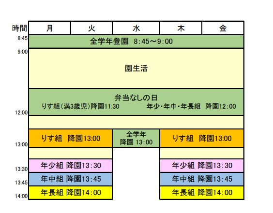 幼稚園でのおおまかな生活時間です。年齢によって違います。