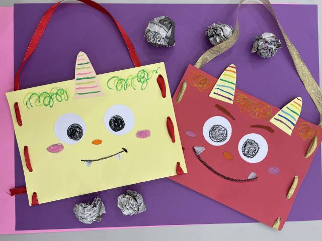 画用紙でできた手提げバッグに、鬼さんのツノや目鼻を付けて自分だけの豆まきバッグを作りましょう!