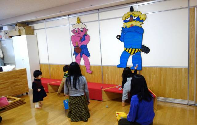 バッグに思い思いの鬼の顔をつくり,みんなで豆まきを楽しみました。