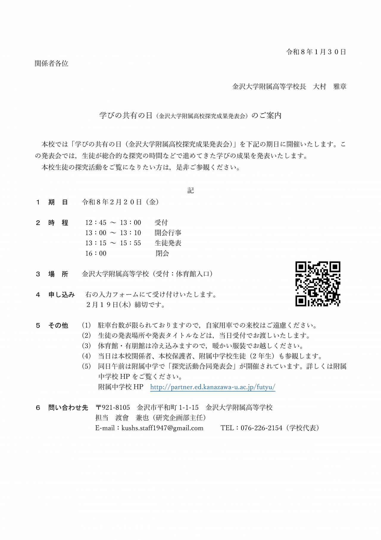 学びの共有の日(金沢大学附属高校探究成果発表会)のご案内