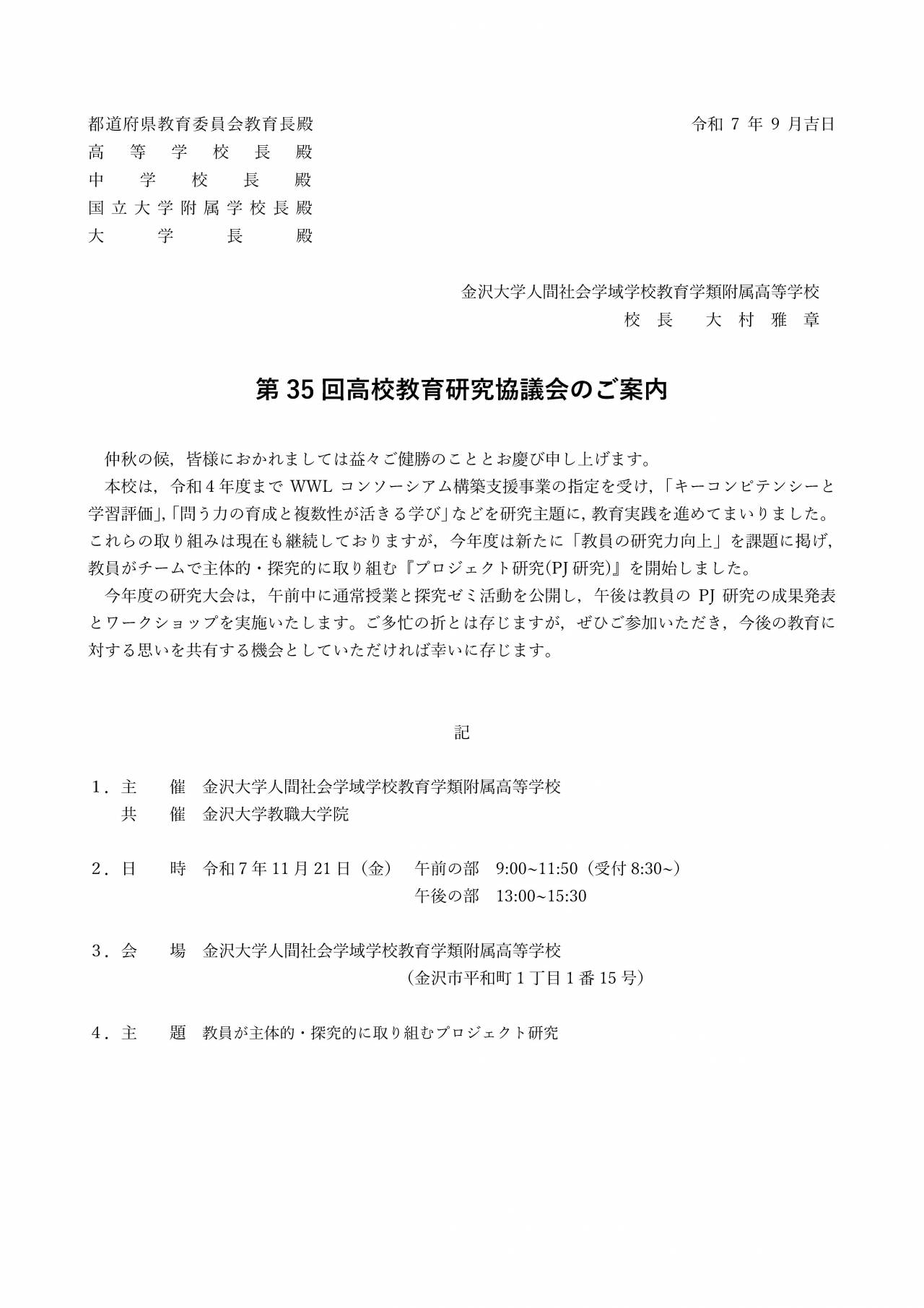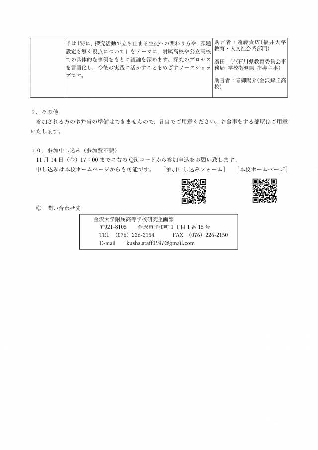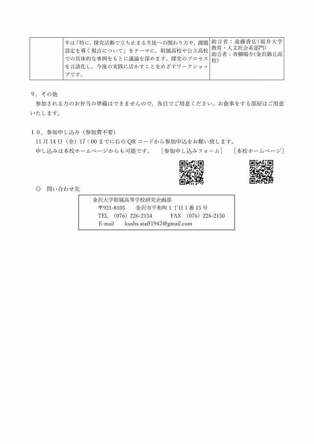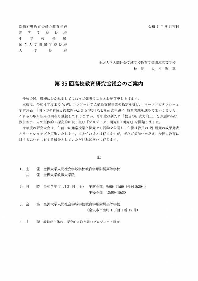 令和7年度金沢大学附属高校研究大会 二次案内 2025年10月01日 上記と同じ内容のPDFです。 研究大会 申し込みサイトへのリンクです。 https://forms.gle/2jrJJLWqxERkMqkX7